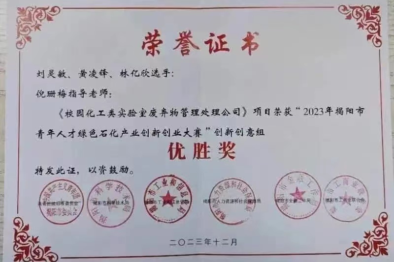 2023年11月化学工程系积极参加揭阳市青年人才绿色石化产业创新创业大赛创新创意组,此次比赛旨在培育绿色石化人才,助推揭阳高质量发展。该团队于 11 月 15 日成功通过初赛,12 月 2 日顺利晋级复赛。