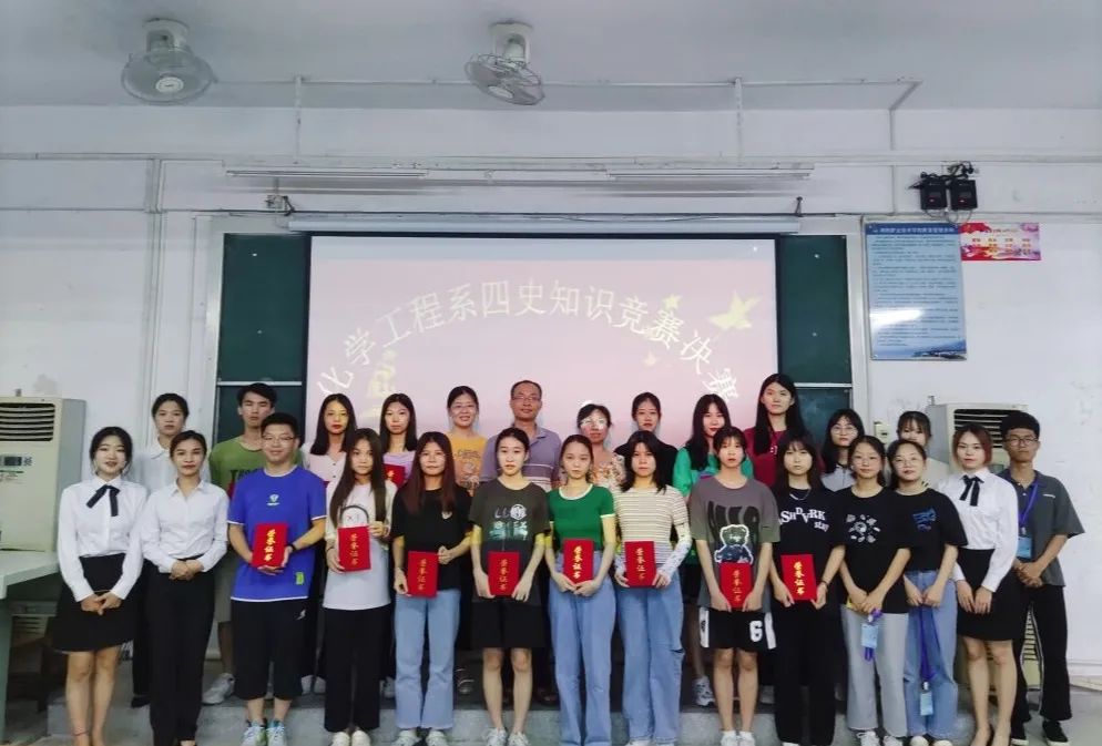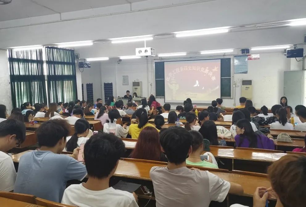 比赛分为初赛和决赛两个阶段。6月6日举办的初赛为网络答题形式,共有50名同学参加,得分最高的15位同学进入6月18日举行的决赛。决赛于6月18日中午在教学楼CT21举行,由黄彩红和吴杏芬两位主持人主持,化工系党总支副书记陈敏杰老师、学生党支部书记刘淑媛老师、2020级辅导员刘月颖老师及学生代表参加了此次活动。