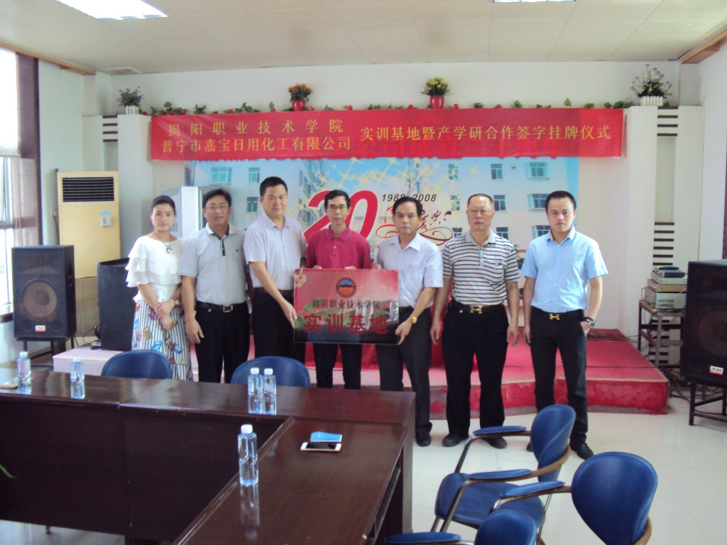 5月13日上午,我院在普宁市嘉宝日用化工有限公司举行校外实训基地暨产学研合作签字挂牌仪式。龚善初院长、化工系江英志主任、实训中心杨培新主任;嘉宝公司王守宋总经理等参加了本次活动。