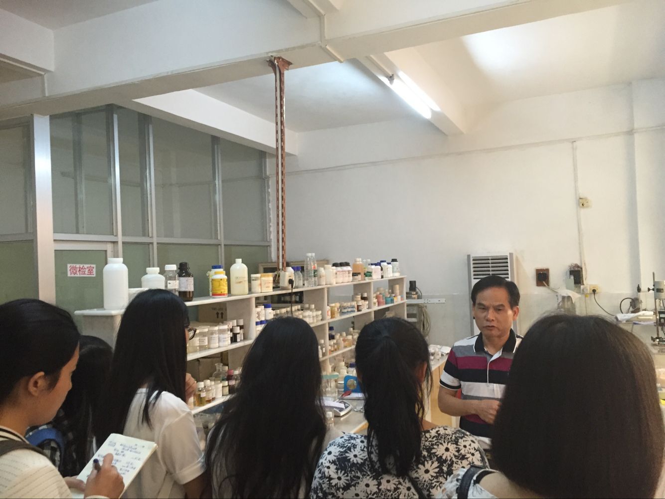 为深入了解化妆品企业一线生产工艺、理化及微生物检测手段,5月19日,在化工系主任江英志、精细化工教研室主任林壮森、李静、刘淑媛、陈关涛、李思慧等老师的带领下,精化151班学生前往我院产学研合作单位、校外实训基地——普宁市嘉宝日用化工有限公司进行专业见习,调研组一行受到该公司副总经理王守宋、厂长黄汉光、技术部经理李钦元、人事部经理陈燕芬等的热情接待。