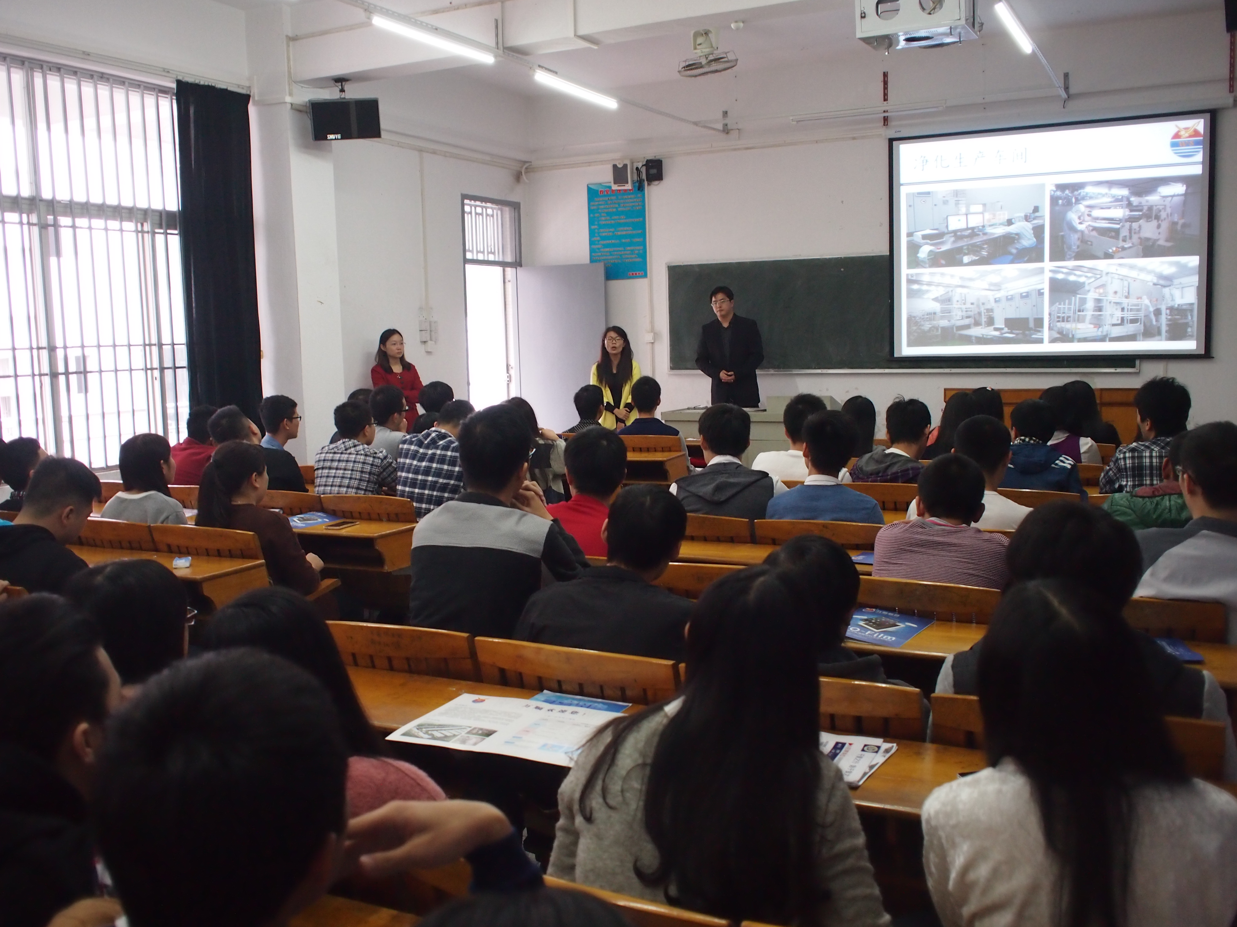 为促进学生就业,我系诚邀汕头万顺包装材料股份有限公司光电薄膜分公司来校进行企业宣讲活动,宣讲会于12月23日中午在教学楼B401举行,主讲人是公司生产总监黄至玮博士,一同前来的还有郑妙玲、陈擎两位人事部工作人员;参加此次宣讲会的有化学工程系王宜民老师、陈敏杰老师、精化131、商检131、石化营销131全体同学以及团总支学生会网络部、新闻小组成员。