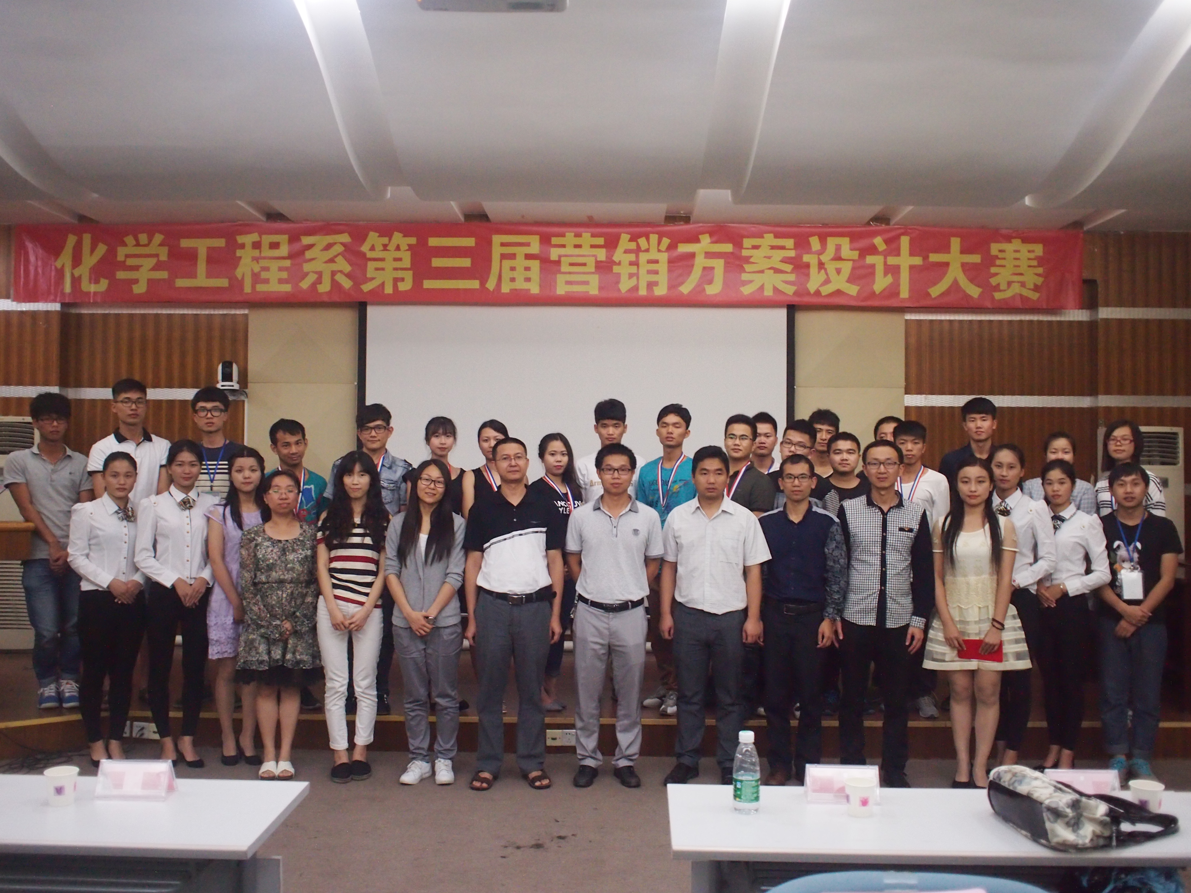 2015年5月24号晚,化工系在教学楼AT21举办第三届营销方案设计大赛总决赛,总共有六支队伍经过初赛的选拔进入了当晚的决赛。决赛由自电子商务学院的朱良辉老师和钱远芳老师、来自经济管理系系的孙警老师、来自化学工程系的王宜民老师和李思慧老师担任评委,到场的嘉宾还有化工系党总支赖少坤副书记以及辅导员刘淑媛老师和陈佳春老师,各学生组织也派代表到场观摩了本次决赛。决赛主持人是14级的林慧敏和陈璐瑢。